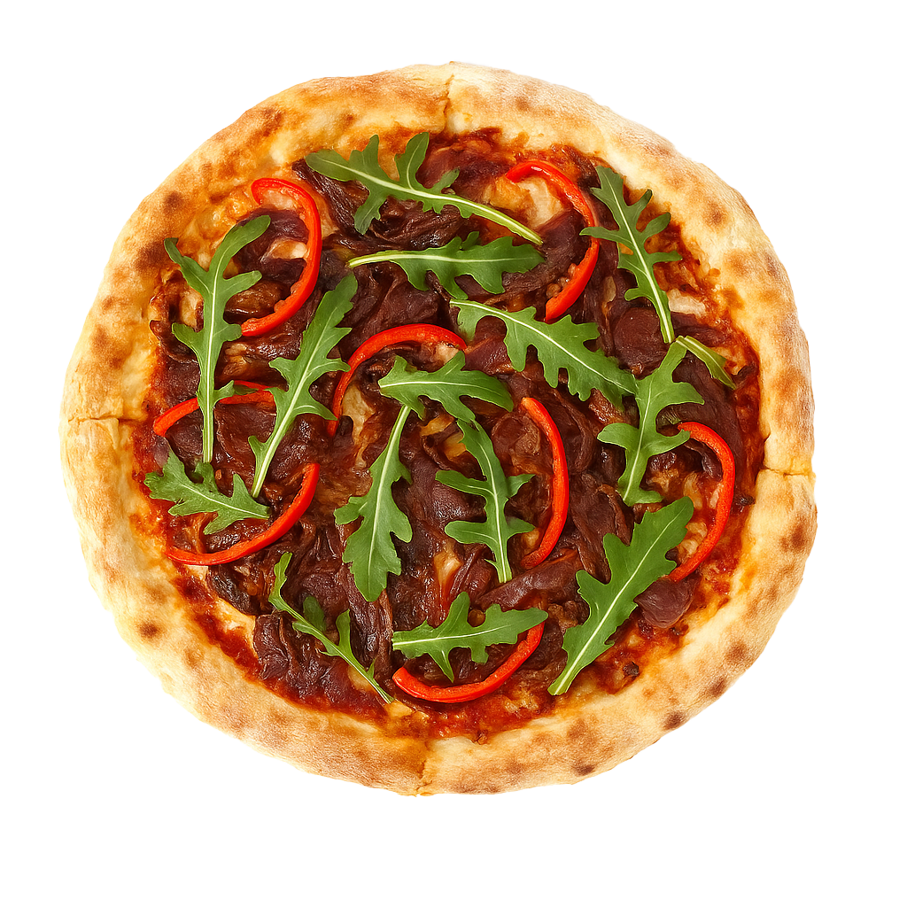 Rúcula fresca, cebolla caramelizada,